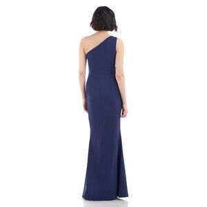 New with Tag, list price $248, JS Collections women's Lilah Navy Blue Bow Accent One Shoulder Crepe Knit Long Mermaid Gown Maxi Dress, size 0, fully lined, wide one shoulder strap with silicone grip fashion tape to keep the dress in place, hidden zipper left side, empire waist.