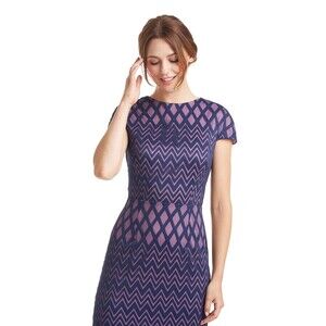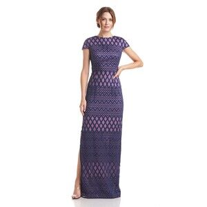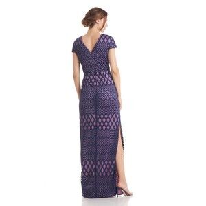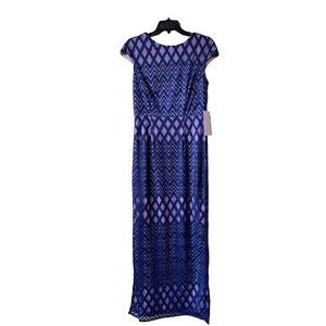 New with Tag, list price $188, JS Collections women's Navy Blue & Lavender Linda Cap Sleeve Embroidered Long Column Gown with Side Slit, size 4, dark navy blue stretch semi-sheer knit overlay with lavender stretch knit lining, jewel neck with V-back, darts at bodice, hidden back zipper, 23 inch vent slit at left side starting from lower thigh to hem edge.