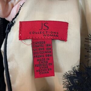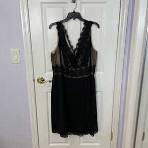 Description: This dress is a knockout. Sleeveless with sheer black lace netting over a beige lining makes a striking impression. Elegant faux wrap skirt has a flattering asymmetrical drape. Back zip. Lined