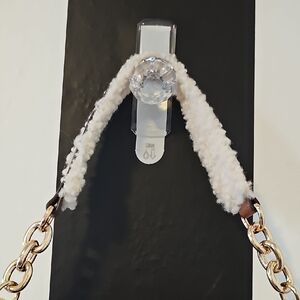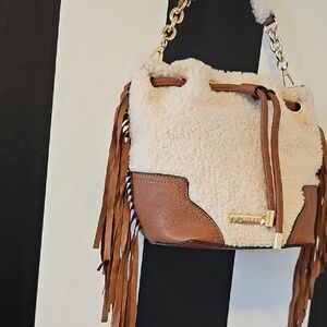 Stylish shearling and leather bucket bag with fringe details. Perfect for adding a touch of elegance to any outfit.