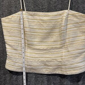 JS collections formal, twinset bustiere and jacket, ivory and Gold metallic stripe plus size 16 on both pieces. gently preowned having been worn one time. Both are Fully lined. bustiere zips up the back jacket is open Measurements are approximate and are taken lying flat: measurements are in photos PLEASE - See all photos, Check the provided measurements, and ask all questions PRIOR to purchasing. NO returns on this item – sadly due to several “wear and return / wardrobing” issues with special occasion wear, this item will be sent with tamperproof tag. This is not a rental. In addition to item photos, listed here, (there is a limit on how many I can list) I have photographed All areas of this garment along with the packaging and shipping process. Please contact me if you have questions about this. Keywords for search: holiday, evening, Christmas, Xmas, New Year’s, party, dressy, special occasion, formal, ivory, off-white, metallic, gold, striped, wedding mother of the bride groom