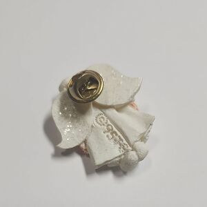 Charming white angel brooch with a blue bow and glittery wings. Perfect for adding a touch of whimsy to any outfit.