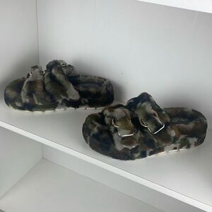 Additional Details: Camouflage printed shearling fur uppers, fixed double straps across top of foot, silver and gold faux buckle accents.