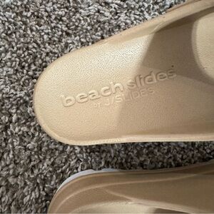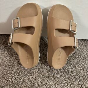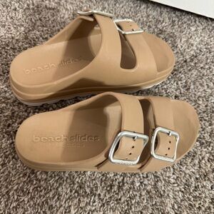 J/SLIDES Tan Sandals with Silver Buckles Size 6