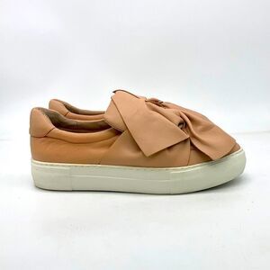 Slip on sneaker features blush pink leather with large bow. 1.25 inch platform.