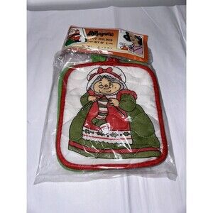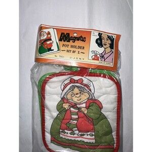 Add a touch of vintage charm to your kitchen with this set of two J.S.N.Y Santa magnetic pot holders. Made in Taiwan in the 1970s, these rectangular holders are designed with a festive theme of Santa and Mrs. Claus. The colorful multicolor design is perfect for the holiday season of Christmas.