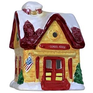 Create a festive ambiance with this vintage holiday village ceramic candle holder featuring a charming schoolhouse with a patriotic USA standing proud in the design. Perfect for adding a nostalgic touch to your holiday decor or as a thoughtful gift for collectors of seasonal decorations
