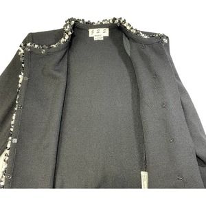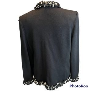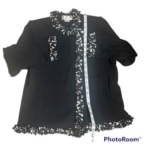 JSS is know for its class and wonderful quality. This lovely top is a timeless piece and can be worn dressy or casual. Hidden snap button down closure. Long-sleeves with black and white fridge accents around the wrist. Round neck with fridge accents. Shoulder pads for added fit