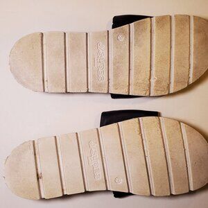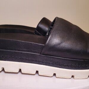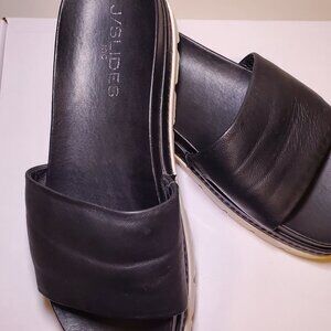 Mens JSLIDES Leather Upper. Rubber sole is a 2" platform w/ a groove contrast forms a cushy foam foot bed.