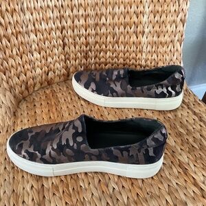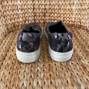 Gently worn. Very comfortable. Slip-on sneakers. Color is primarily black with bronze/rose gold camo pattern.