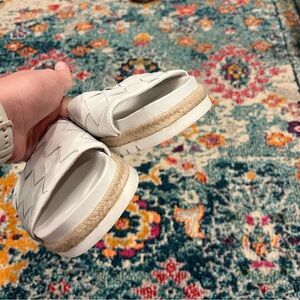 DETAILS: J/Slides sandals women's 8.5, Rollie style in white, woven leather upper, jute trim, sporty lug soles.