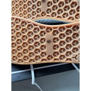 Flexible, geometric textured white midsole with tan rubber outsole for traction