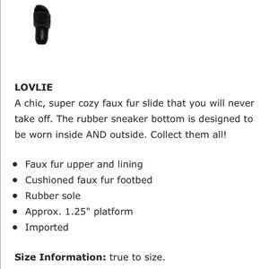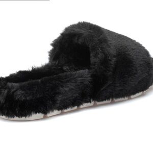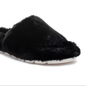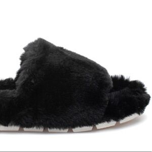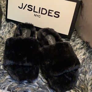 brand new black furry J slides slippers that are meant to be worn inside or outside. These are so super soft and look adorable on your feet. They are true to size the sevens will also fit a 7 1/2. They have a cushioned insole and are so comfy and Chic. Brand New in box.