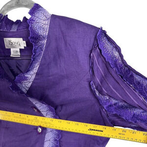JSong collection purple skirt linen jacket women's clothing leaf design outfit size 12 clothing elegant purple set v-neck jacket button closure relaxed fit mid-length skirt floral details designer outfit