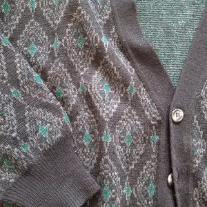 Vintage patterned sweater in great condition. Lightly worn but very minimal pilling. Green/gray/black color palate. Material is thick, 70% acrylic and 30% wool.