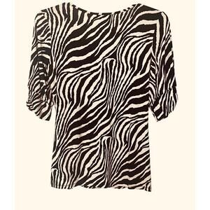 J.T.B. SHORT SLV PULL-OVER RND NECK FRINGE BLOUSE, WOMENS, L, BLACK & TAN ANIMAL