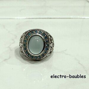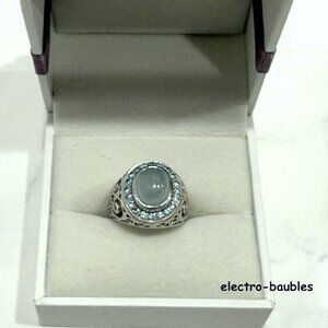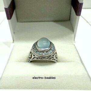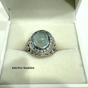 Beautiful JTV Chalcedony & Blue topaz Statement Ring Sterling Silver Filagree Setting A one carat cabochon aqua chalcedony Center stone measures 7.5 x 9.5 Haloed by 24 sparkly blue topaz measuring 1.5mm equaling .36 carats Size 8 Ladies Condition - new never worn. Ships in black ring box Ships from a clean, smoke-free environment. MSRP $179.99