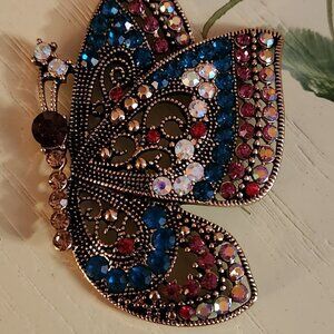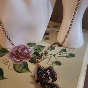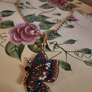 Off Park R Collection multicolor crystal antique bronze butterfly enhancer with chain. The chain is approximately 36 inches long with a 3 inch extender. The butterfly is about 3 inches long. Purchased from JTV in 2020. Never worn and in like new condition, but no longer in original packaging. The pictures are of the actual item from my personal collection.