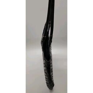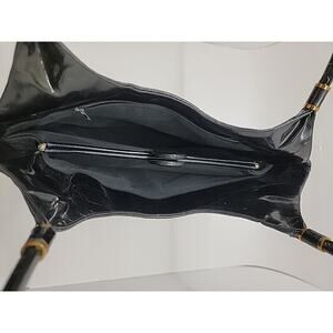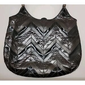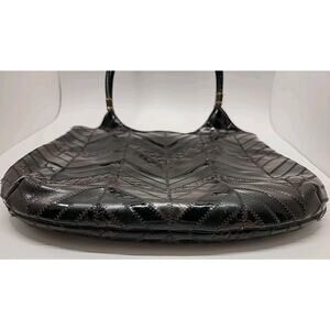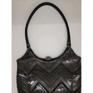 This listing is for a rare 1980s vintage Judith Leiber shoulder bag, authenticated and certified by Authentic Detective. Features include elegant leather patchwork in black and brown, showcasing mixed finishes (smooth, patent, reptile-textured), a soft slouchy silhouette, and gold-tone accents. The 11" strap drop makes it a perfect underarm carry.