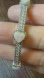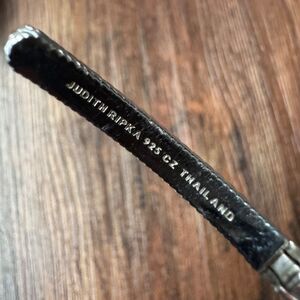This is a vintage estate Judith Ripka bracelet. It is a sterling silver hinged cuff featuring three pink hearts of Mother of Pearl and lots of CZ accent stone pave-set between them. The inside has the signature fleur de lis cut-outs and is signed Judith Ripka 925 CZ Thailand.