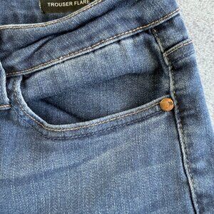 Style: high‑rise flare jeans with 5 button‑fly and classic five‑pocket construction