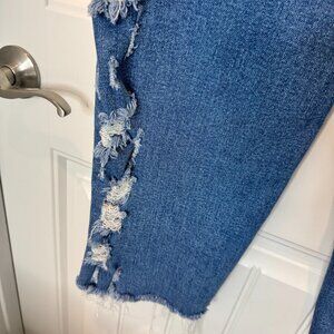These medium blue jeans feature a high waist, heavy destroy detailing, and a crop straight leg design with side seam detailing.