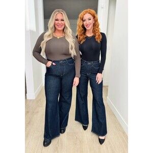 These Judy Blue Retro Wide Leg Denim Jeans in size 14W offer a modern chic casual style with a dark wash blue color. Made from a comfortable cotton blend denim fabric, these jeans are machine washable for easy care. The wide-leg style gives a trendy and retro vibe, perfect for a bohemian or city-inspired look. Judy Blue brand ensures quality and style for women looking for a versatile addition to their wardrobe.