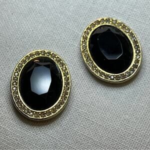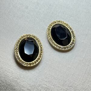 JUDY LEE VINTAGE 1950s Faux Gold Diamond & Black Facet Stone Oval Clip Earrings