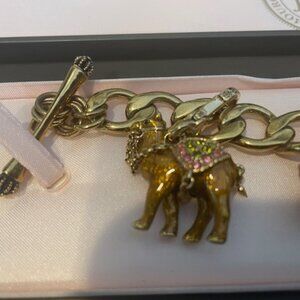 For your consideration is this preowned, but barely worn, Juicy Couture Toggle Charm Bracelet that I had for years. The cool thing is you can buy special, unique charms for this. This bracelet has a camel (I rode one in Egypt), airplane (I'm a retired flight attendant) and a heart! Complete with its original box, it's just time to have someone else enjoy it. This bracelet and its charms are retired, but you can find different charms on eBay.
