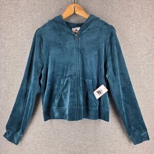 Brand: Juicy by Juicy Couture Size: Girls XL (16) Color: Teal / Purple embroidery Material: 95% Polyester, 5% Spandex (Velour blend) Design: Full zip, hooded, embroidered crown logo, “JUICY” on hood Condition: New with tags • Fabric: Pristine • Zipper: Smooth • Graphics: Crisp