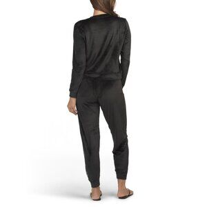 3 piece set includes 1 pajama top, 1 pair of matching shorts and 1 pair of matching pants, brand logo accents, fabric provides stretch, velvet fleece finish, velour texture, Top: long sleeve, crew neck, rhinestone embellished brand logo front