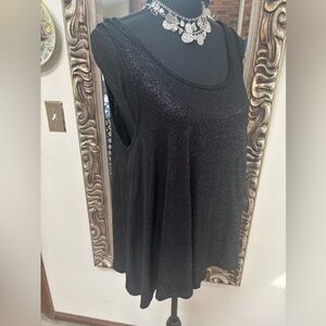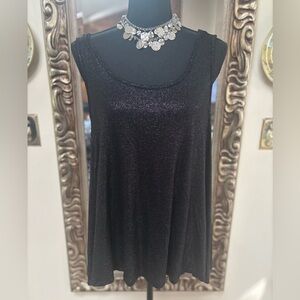 Chic black tank top with a shimmering finish. Perfect for a night out. Stylish and versatile, loose fitting and drapy. Measurements 21” ptp, 24” length.