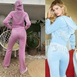 Get back to your style roots with this Juicy Couture Bling 2 Piece Sweatsuit Set. Soft Velour keeps you warm and comfortable. The Juicy Logo outlined in rhinestones adds flare to your style.