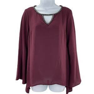 JUICY COUTURE Burgundy Bell Sleeve Rhinestone Trim Keyhole V-Neck Top Blouse