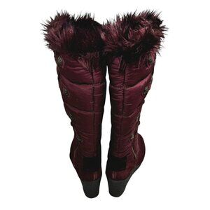 Quilted burgundy nylon upper with logo buttons and faux fur tim. Theyhave a 3" wedge heel offset by a 1" platform. Full Size zip.