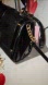 HANDBAG: Patent vegan leather with signature logo throughout. Fixed adjustable crossbody strap, top handle, Snap closure. inner slip pocket and zip pocket. back slip pocket. Approximately 9w X 6h X 4 deep.