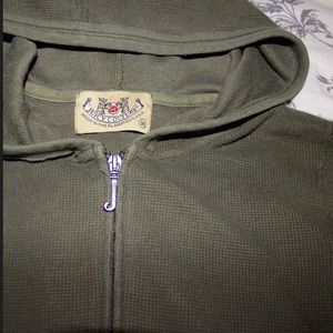 JUICY COUTURE glamorous, irreverent, and fun.  A lifestyle brand for the decidedly fashionable. Olive green knit track jacket, perfect for the spring/summer, and great worn as a layering piece in the colder seasons. Like the item, but not the price? Make an offer! ๐ฆ๐๐ก
