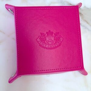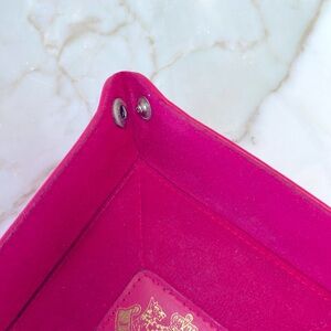 JUICY COUTURE HOT PINK LEATHER/SUEDE SNAP CLOSURE CONTAINER 5” X 5 1/2” X 1 1/4” INCH HIGH CLOSED. VERY GOOD CONDITION 🩷🩷🩷