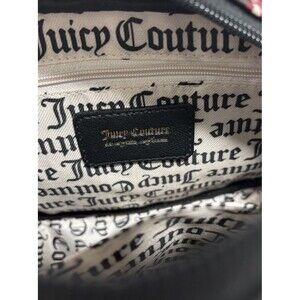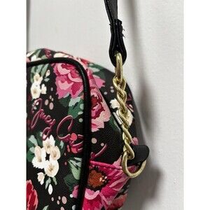 This Juicy Couture LA Pink Floral Bag is a medium-sized crossbody bag featuring a fun floral pattern. The bag has a zip closure, gold-plated hardware, and a black faux leather crossbody strap with chain accents. It includes inner pockets, is lightweight and water-resistant, and has an adjustable strap for convenience. The exterior is made of faux leather with a matte finish, while the interior lining is beige with the Juicy Couture logo. This stylish and practical bag is perfect for travel, parties, or casual outings.