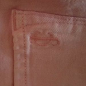 Gold button closure, 5 pockets. Embroidered LOGO on back pocket.