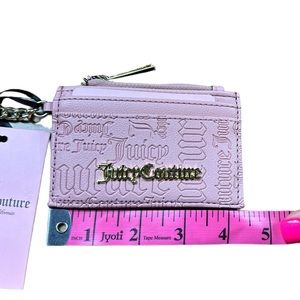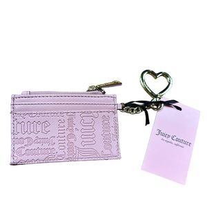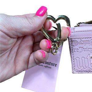JUICY COUTURE pink Leather Wallet Card Holder Keychain with Gold Logo. Heart shaped good keychain hook with logo embedded in heart. 4 card pockets on exterior of wallet, zipper pocket at top with logo fabric inside. Leather exterior in pink. Gold hardware logo on front of wallet. Embossed logo on leather on both sides. New with tags. Excellent condition. Approximately 4” x 3”