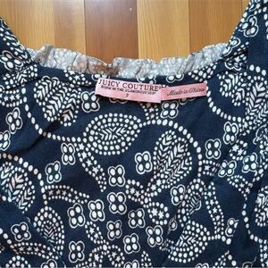 Charming and lightweight, this Juicy Couture dress features a navy and white paisley dot print with sheer flutter sleeves and silk-trimmed side panels. It has a gathered waist, a V-neckline, and a pull-on style—perfect for warmer days. Made from soft viscose with silk accents.