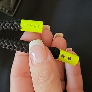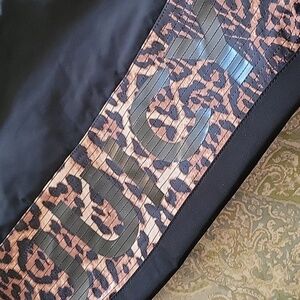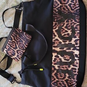 Extra large heavy duty nylon tote with optional crossbody adjustable length shoulder strap. Clip-on tethered cheetah pattern wristlet. Bold PVC lettering and stitching on front; two webbed drop pockets on back. XL durable zipper pull. Fully lined; large drop pocket and deep zippered pocket inside.