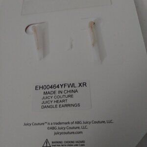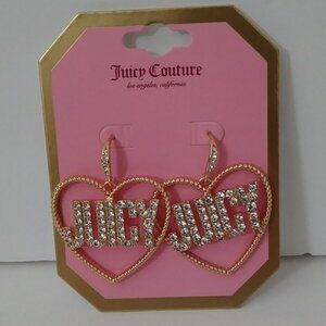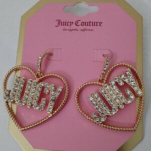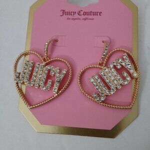 Super Cute Juicy Couture Rhinestone Logo Heart Earrings Heart Logo Hoop Earrings A pair of gold tone hoop earrings featuring glass stones and Juicy text centerpiece.
