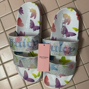 Step into style with these Juicy Couture sandals, featuring a chic white base adorned with pastel butterflies. The sparkling wide straps offer a comfortable fit, while the cushioned footbed ensures all-day comfort. Perfect for adding a touch of beauty to your casual days out. Size 7 NWT & positively perfect. Suitable for gifting
