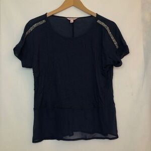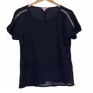 JUICY COUTURE Solid Navy Blue Mixed Media Material Semi Sheer Druzy Blouse Top