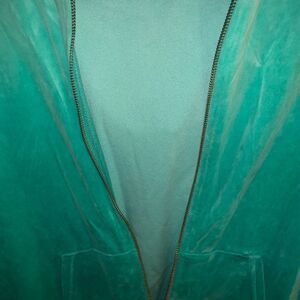 NEVER WORN!! Juicy Couture Velour hoodie with gold hardware “J” zipper. This is a size Medium and is actually true to size unlike the typical juicy sizing with the sweatsuits. It is a beautiful deep turquoise and has a very slight ombré effect on the back. There is no detailing or designs on the back.