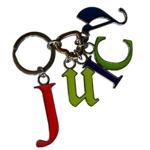 - Key fob has dangling "j u i c y" charm letter in different colored.