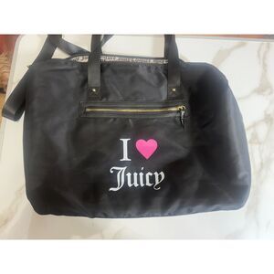JUICY COUTURE XL "I Love Juicy" Black Overnighter Weekender Duffle Bag. In good used condition. Approximate measurements are 18" x 14" x 8". 2 Interior slip pockets, 1 interior zip pocket, 1 exterior zippered pocket. Lightweight, water resistant, stain resistant. Adjustable Shoulder Strap.