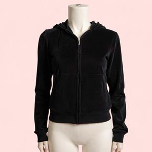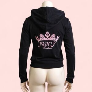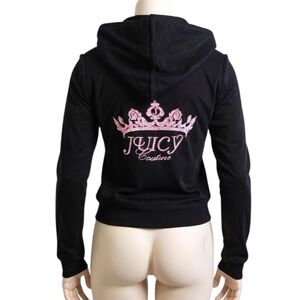 Rare find! You'll find JC hoodies all day long, but not a NWT deadstock vintage Juicy Couture velour track suit hoodie WITH the JC crown embellishment on the back!! 😵 This full-zip Juicy Couture hoodie is an iconic piece of early 2000s fashion—casual yet undeniably luxe, blending comfort with celebrity-inspired flair. The front of the jacket is minimalist solid black and adorned with the Juicy “J” logo zipper pull. The back of the jacket has a painted distressed pink crown with rhinestone embellishments with the words “Juicy Couture” underneath.